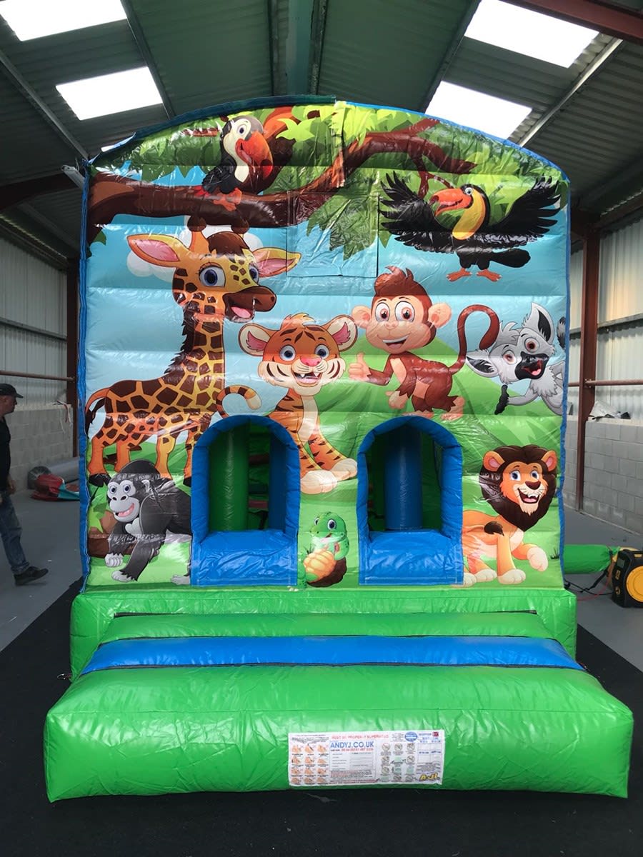 The jungle has arrived, Jump thought the entrance's to the Bounce Area with Bashers for some bashing time before climbing the wall up to the slide to the exit.