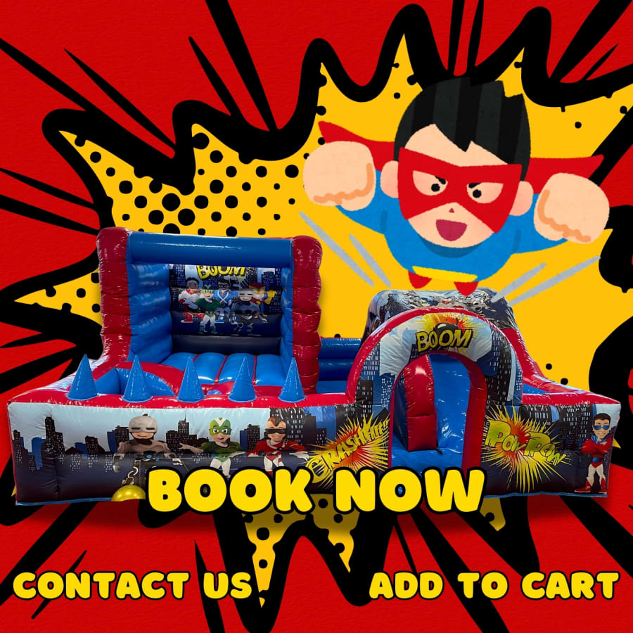 Unleash the power of fun with our Play Park Superhero / Action Hero hire in Northern Ireland! Perfect for birthday parties, school events, and community festivals in Belfast, Derry, and throughout the region, this superhero-themed inflatable play park is guaranteed to excite kids. Featuring plenty of space for jumping, and a slide, children can bounce their way through their very own superhero adventure. Whether you have little action heroes or aspiring superheroes, this play park is designed for endless fun and excitement. Fully insured and well-maintained, our Play Park Superhero / Action Hero is a safe and thrilling addition to any event. We provide hassle-free delivery, setup, and collection, allowing you to focus on the fun. Make your child’s party a super event with the Play Park Superhero!