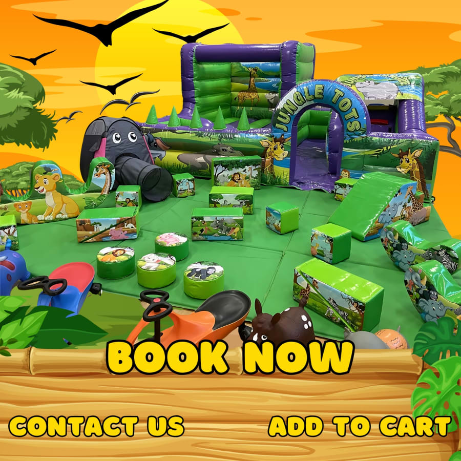🌴 But that's not all! Our large soft play set up features adorable animal bouncers and wiggle cars, adding an extra element of excitement to the party. Your little guests can hop on the back of a friendly monkey or ride around in a wiggle car.